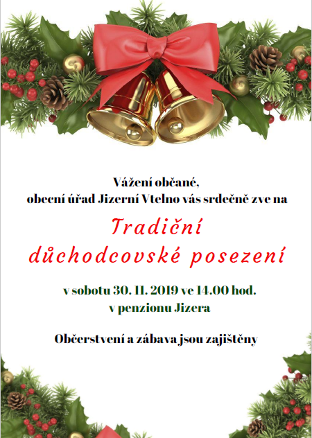 Obec Jizerní Vtelno zve občany na Tradiční důchodcovské posezení, které se bude konat v sobotu 30. 11. 2019 od 14:00 v penzionu Jizera.