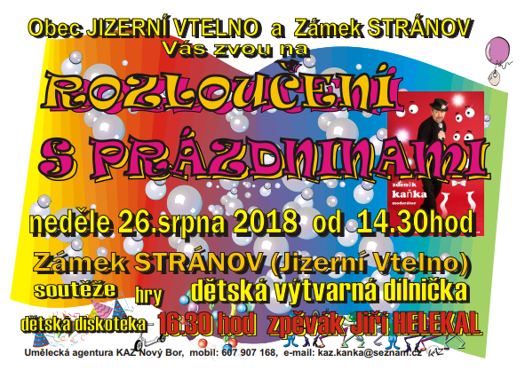 Obec Jizerní Vtelno a zámek Stránov vás zvou na Rozloučení s prázdninami. Budou zde připraveny soutěže, hry, dílničky a dětská diskotéka. Od 16:30 zde vystoupí Jiří Helekal.